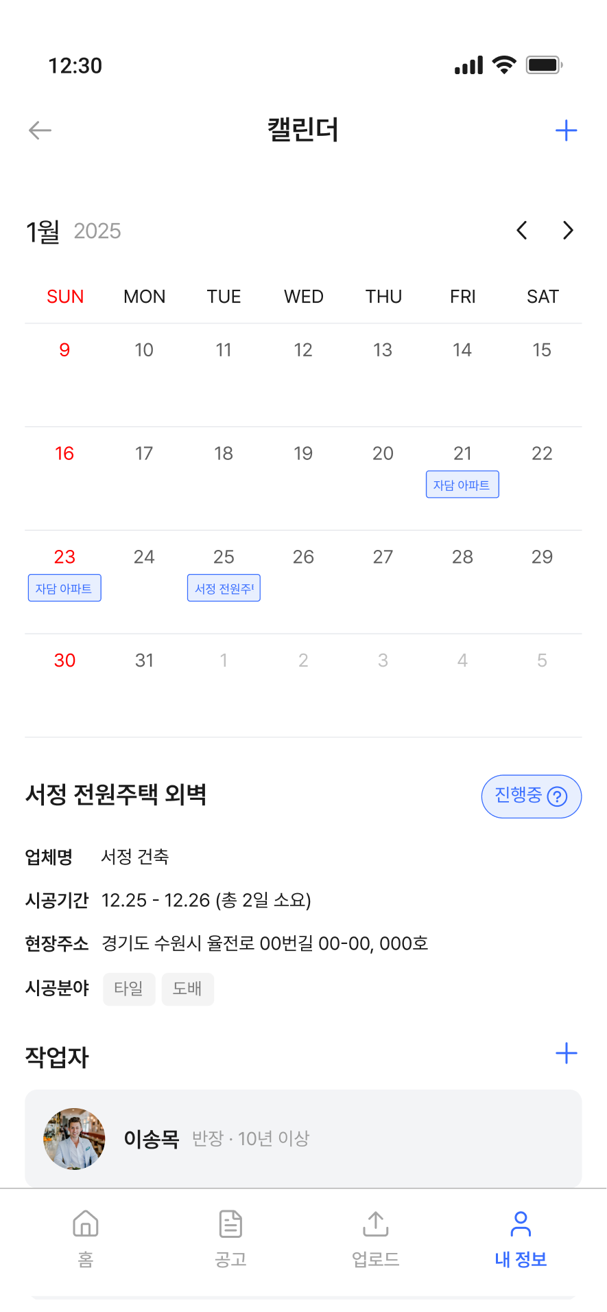 현장명, 위치, 시간을 한 번에 확인하고 팀원과 일감을 간편하게 공유해요